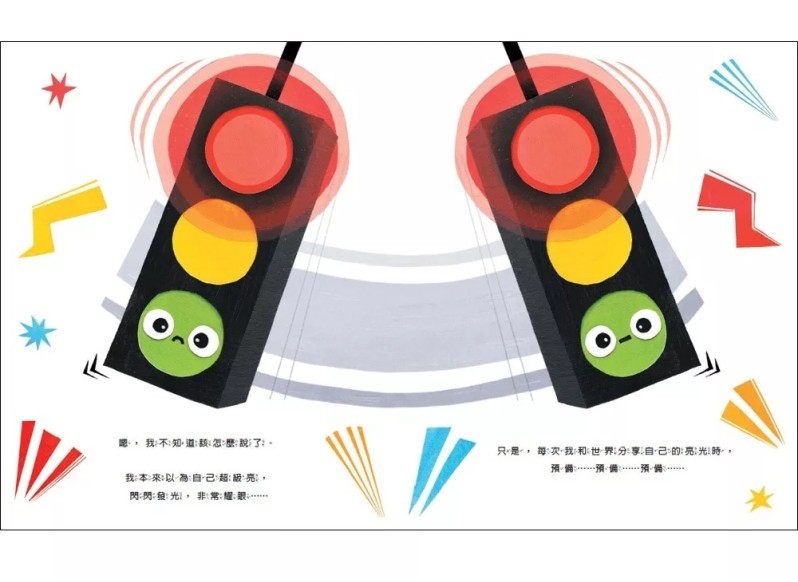 「我是綠燈,我有一項很重要的工作,但每次輪到我發光時,大家都馬上把車開走!汽車在紅燈時停下來,看到黃燈會放慢速度,為什麼它們總是以最快的速度離開我。於是,我決定要停止發光!」