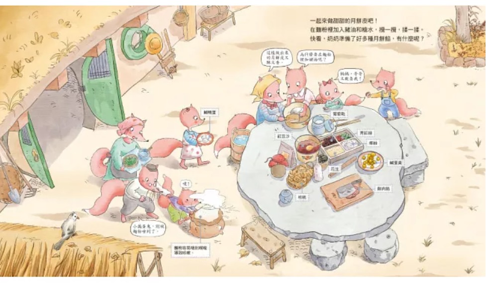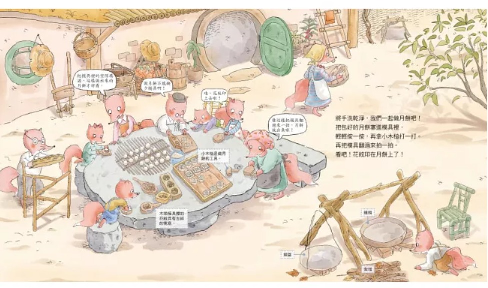 《中秋節.做月餅》中的狐狸一家人,不僅喜歡品嘗美食,廚藝也同樣拿手。故事中,他牠分享從備料、和麵、做餡料、敲月餅模到烤月餅的過程,讓讀者可以認識傳統月餅的製作。作者還貼心地整理了製作要點,方便大家在家嘗試製作月餅。